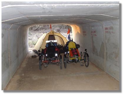 After 45 kilometres we came to the small town of Lalbert complete with obligatory grain silo, a run down pub and small general store. Just before town was an iron man mailbox complete with dog and umbrella, well, the remains of one. With the mercury around 45 deg (on the road) we pulled up in the shade and went into the store and bought an ice-cream before sitting outside and catching up on our journals and then devouring and egg and bacon roll. A brief chat with some locals and then we were off down the road to see if we could make it all the way to Wycheproof, or failing that find a decent campsite. The wind had picked up and we were battling into it, the temperature remaining in the mid 40's and progress was getting slower and slower. We took a short break in some shade on a side road before continuing on and eventually arriving at a very dry Lalbert Creek. An inspection of the road bridge however showed that it was possible to get down to the creek bed and secondly to get under the bridge. We decided that this would be a great place to get out of the sun and perhaps even provide us with a campsite. We were both quite hot and bothered and so we decided that as we could get out of site under the bridge that we would have one of our one litre milk bottle showers, so we fitted our shower head top to the milk bottle, stripped off and each had a shower, the wind blowing over the water providing us with a very nice cool down. Feeling refreshed we began to set up camp but unfortunately for us, as soon as we had set up we were invaded by a swarm of very thirsty bees, all of whom could smell the water that we had. Cooking our meal and trying to keep the bees at bay with only our safety flags was rather a challenge and during this process Joanne got stung on the arm. So after battling mother nature on two fronts the evening was then spent sitting under the bridge completing journal entries, staying away from the bees and hoping that there was no water on its way down from upstream. |