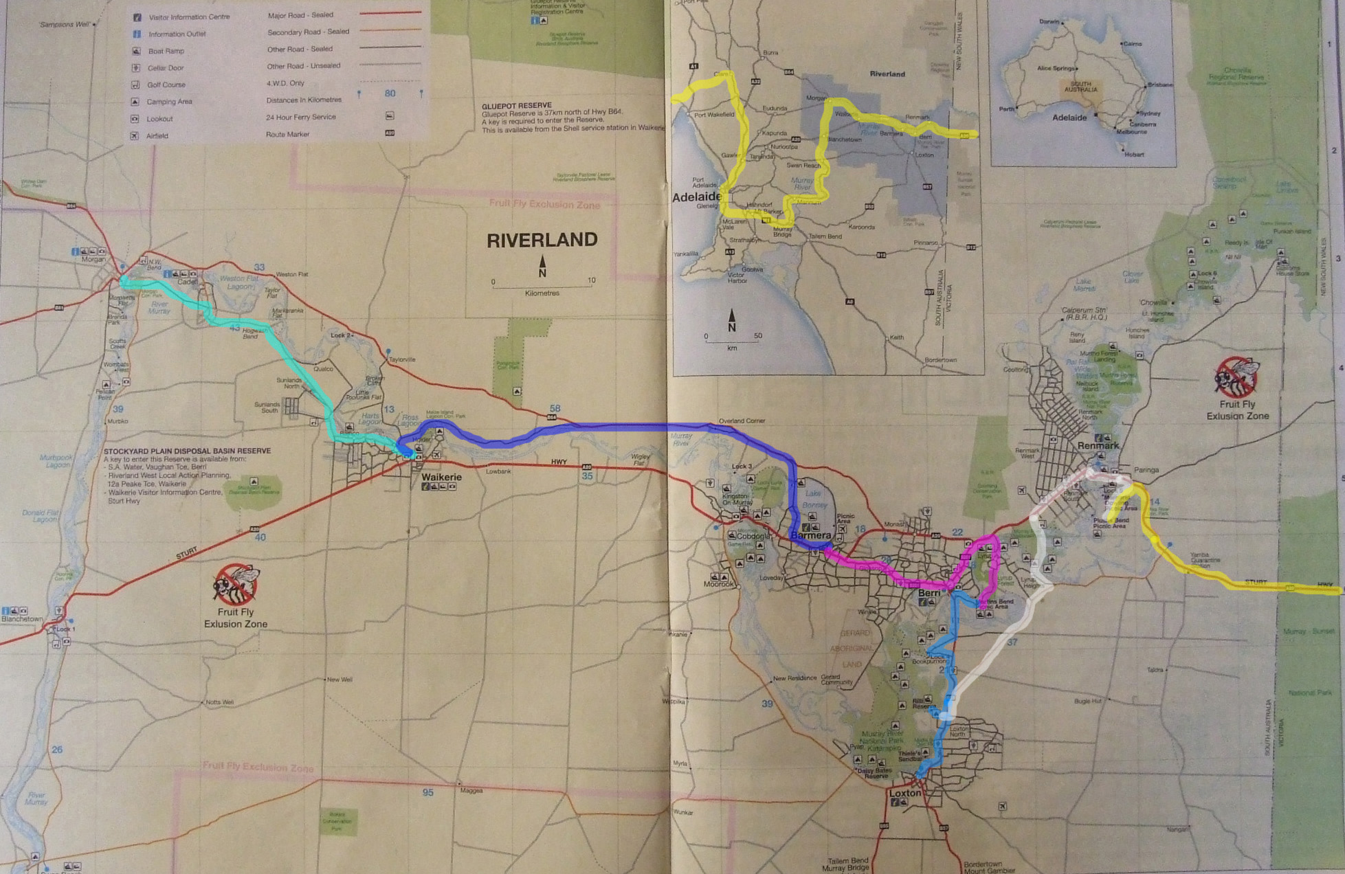 Monday 22 January 2007Today was one of those weird days on the road. We did lots of things but did little and went nowhere and it all seems so confusing. We left Barmera and headed towards Berri, home of Berri juices. From the start we were riding into a headwind and neither of us seemed to have any energy. We stopped along the way to buy dried fruit at a roadside stall and to visit the Angus Park shop, where we both enjoyed a Ginger flavoured Ice-cream, complete with chunks of Ginger. Arriving in Berri we took a little tour around town and had a look through the camping store before buying some lunch and sitting in the main street park to enjoy it. Berri has a nice main street on the side of a hill, a nice green strip with plenty of shady trees separates the traffic flow and it was here that we sat for lunch. We were approached by an older couple who told us of their adventures such as cycling New Zealand, rafting the Murray River, living on a deserted island and walked around Australia pushing a cart with their belongings on it. Whilst talking to them they confirmed the free camping area at Martins Bend on the river and of another one near Loxton our destination for tomorrow. Lunch over we rode up the large hill and onto the Berri Juice Factory where we spent some time looking around in their direct sales office where we bought some items and wished that we had away to carry more. It was then a nice glide down the hill and on to the camping area. On arrival we found a nice free camping area near the Berri Water-ski club and the river. The place is known as Martins Bend Reserve, named after a man called Martin who lived here and when he died he bequeathed his land to the council for use as a free camping area and the caretaker now lives in Martin's old house - Thanks Martin! We set up camp and settled in then Dave & Sue, the couple we met in the main street of Berri came by for a chat. Our new found friends gave us a copy of the newspaper articles, plans and stories on their life on the Murray River in book form and we settled in for a while swapping stories and ideas before they departed. Ideas for another adventure after this one - perhaps. |